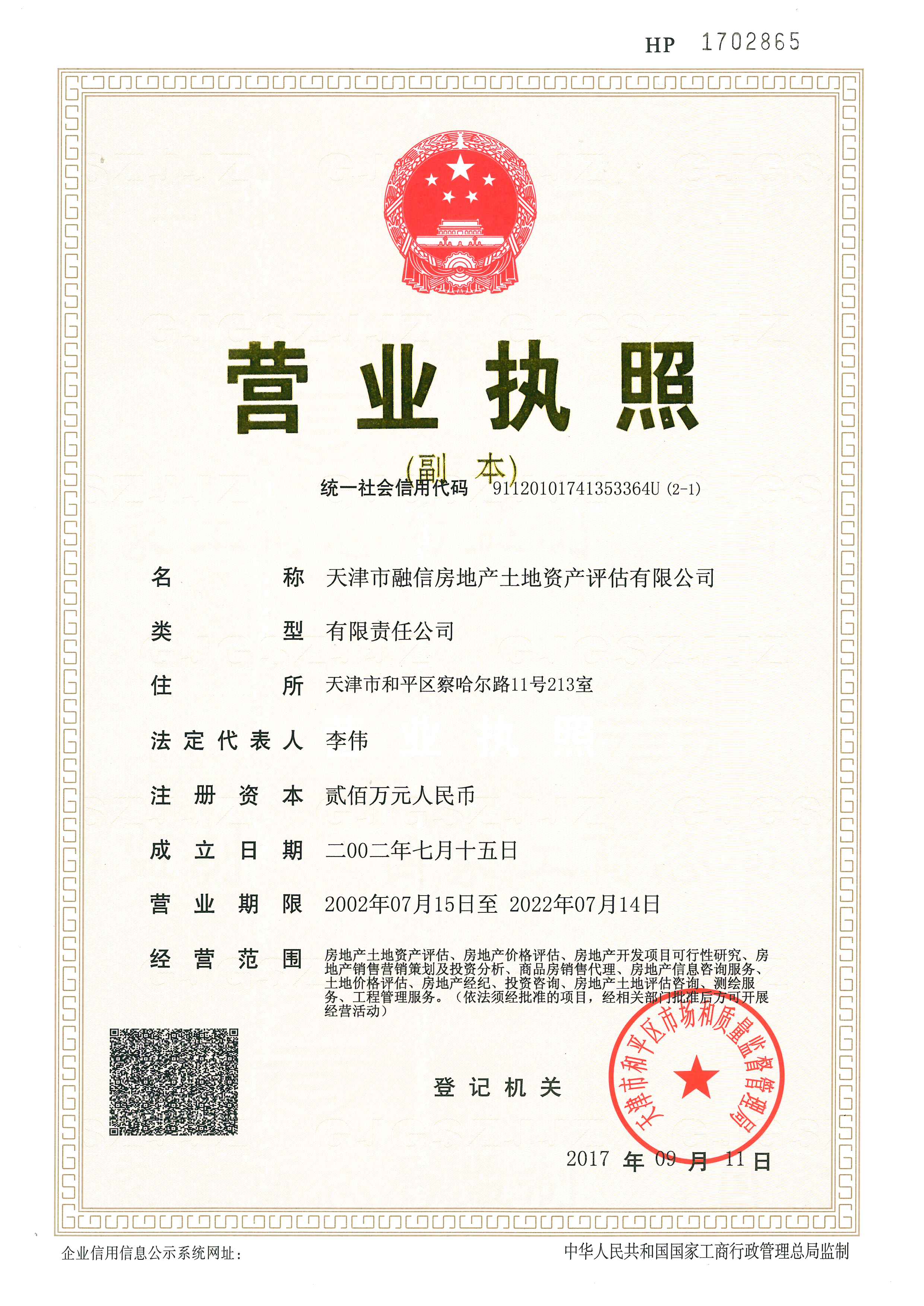 天津市融信房地产土地评估咨询有限责任公司是一家具有房地产评钻国家查级资质、土地评估国家A级资质(全国范围内执业)、土地登记代理资质以及天津市拆迁管理办公室颁发的房屋拆迁估价资质的专业化中介机构。专业从事全国范围内房地产、土地估价业务。业务类型涉及房地产、土地使用权抵押、出让估价、房地产转让、城乡房屋征收(拆迁)等估价业务。