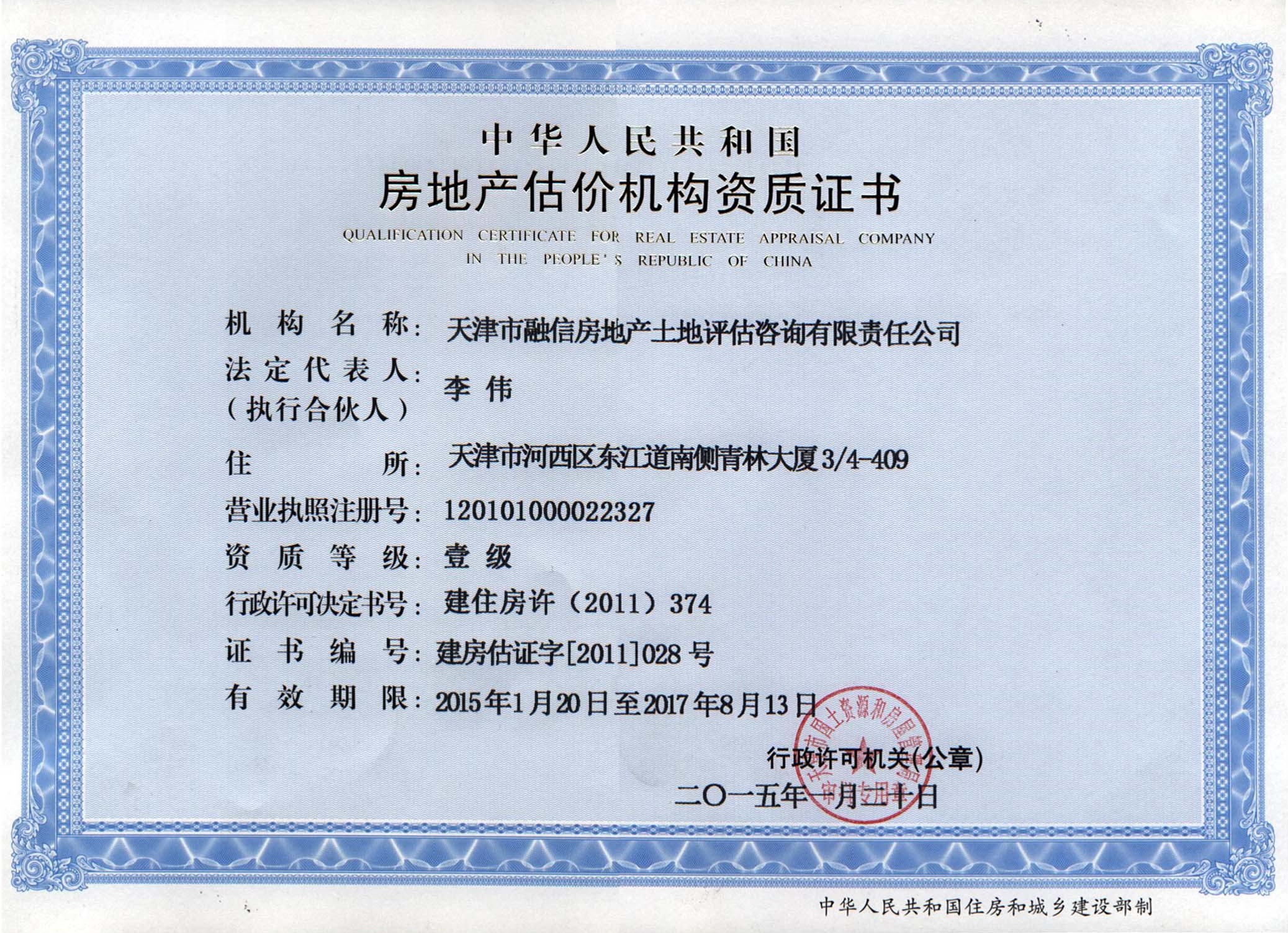 天津市融信房地产土地评估咨询有限责任公司是一家具有房地产评估国家壹级资质、土地评估国家A级资质(全国范围内执业)、土地登记代理资质以及天津市拆迁管理办公室颁发的房屋拆迁估价资质的专业化中介机构。专业从事全国范围内房地产、土地估价业务。业务类型涉及房地产、土地使用权抵押、出让估价、房地产转让、城乡房屋征收(拆迁)等估价业务。